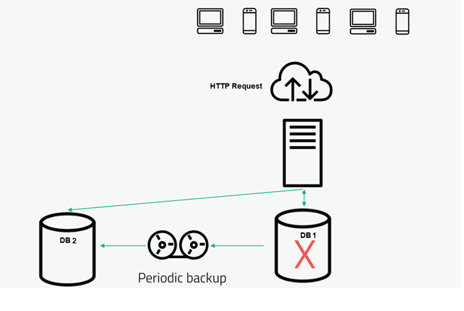 در این سناریو(تصویر 1) زمانی که درخواست HTTP از سمت کاربران به سمت سرور ارسال میشود با از دسترس خارج شدن دیتابیس یک فاجعه به بار می آید برای جلوگیری از این فاجعه می توانیم از داده ها به صورت دوره ای بک آپ گیری کنیم (هر شب ساعت 12) که با از دسترس خارج شدن دیتابیس اول میتوانیم دیتابیس دوم را جایگزین کرده و ترافیک را به سمت دیتابیس جدید هدایت کنیم :