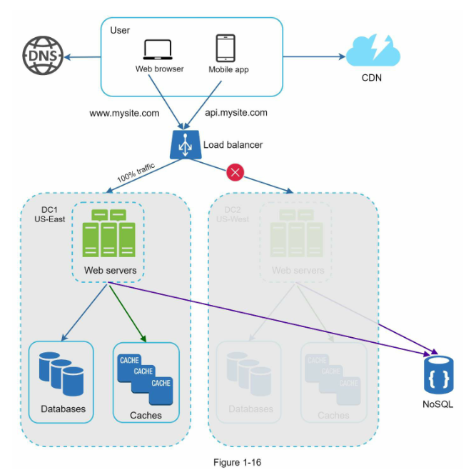 در صورت وقوع هر گونه خرابی مهم در دیتاسنتر، ما تمام ترافیک را به یک دیتاسنتر سالم هدایت میکنیم. در شکل ۱-۱۶، دیتاسنتر ۲ (غرب آمریکا) آفلاین است و تمام ترافیک به دیتاسنتر ۱ (شرق آمریکا) هدایت میشود.