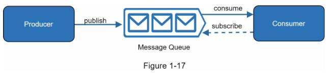 صف پیام یا Message Queue یک قطعه دائمی است که در حافظه ذخیره شده و ارتباطات ناهمزمان را پشتیبانی میکند. این سرویس به عنوان یک بافر عمل میکند و درخواستهای ناهمزمان را توزیع میکند. معماری اولیه یک صف پیام ساده است. سرویسهای ورودی، که تولیدکنندگان/انتشاردهندگان نامیده میشوند، پیامها را ایجاد کرده و آنها را به صف پیام منتشر میکنند. سرویسها یا سرورهای دیگر، که مشترک/مصرف کنندگان نامیده میشوند، به صف متصل میشوند و اقداماتی که توسط پیامها تعریف شده است را انجام میدهند. این مدل در شکل ۱-۱۷ نمایش داده شده است.