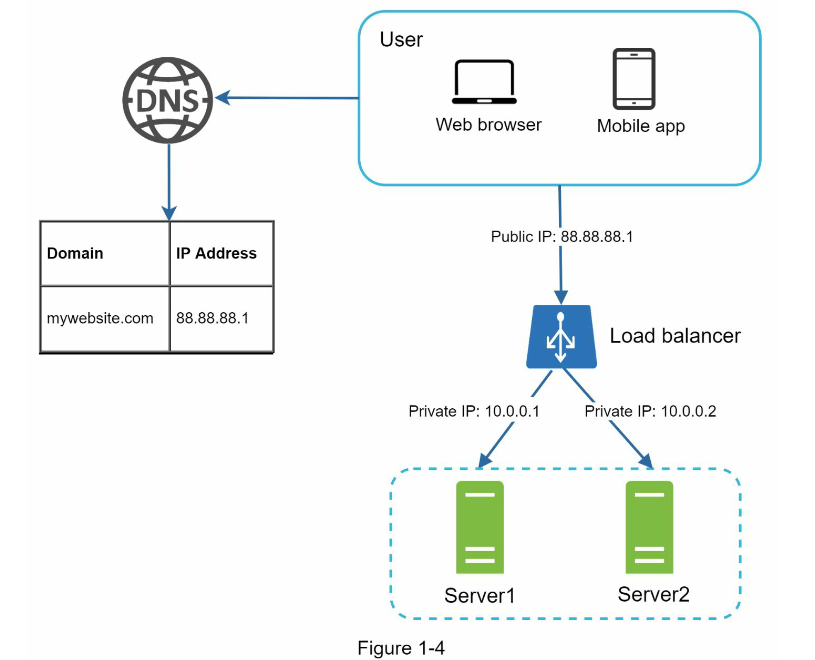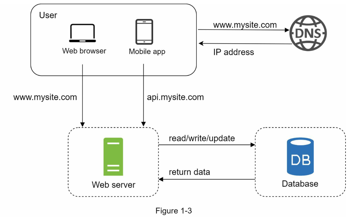 با گسترش کاربران، استفاده از یک سرور دیگر کافی نیست و برای پاسخگویی به نیازهای رو به رشد باید از چندین سرور استفاده کرد. به عنوان مثال، برای مدیریت بار کاری به دو نوع سرور نیاز داریم: یک سرور برای مدیریت ترافیک وب و موبایل و دیگری برای مدیریت پایگاه داده (همانطور که در شکل 1-3 نشان داده شده است). با تفکیک این دو نوع سرور به دو لایه (لایه وب و لایه داده)، امکان مقیاس پذیری مستقل از هم فراهم می شود.