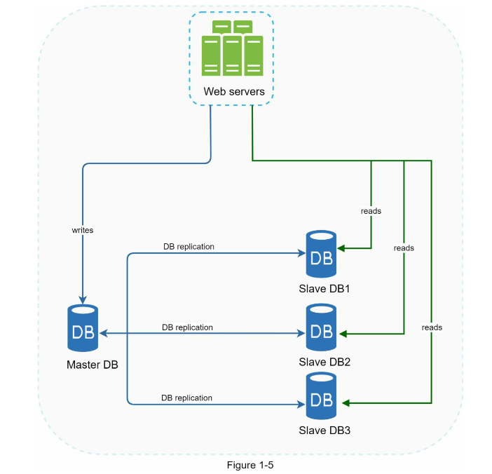 بسیاری از برنامهها نیاز به تعداد خوانده شدن دادهها بیشتر از تعداد نوشتاری دارند؛ بنابراین تعداد پایگاه دادههای slave در یک سیستم رپلیکیشن پایگاه داده، معمولاً بیشتر از تعداد پایگاه دادههای مستر است. شکل 1-5، یک پایگاه داده master با چندین پایگاه داده slave را نشان میدهد.