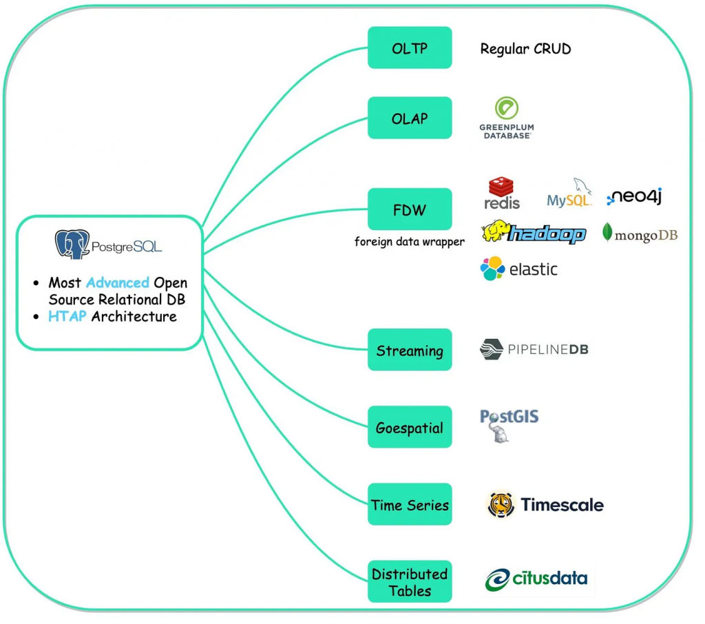 این نمودار موارد استفاده زیادی را توسط PostgreSQL نشان می دهد – پایگاه داده ای که تقریباً تمام موارد استفاده مورد نیاز توسعه دهندگان را شامل می شود.